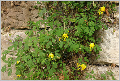 Gelber Lerchensporn an einer alten Stadtmauer; pseudofumaria lutea